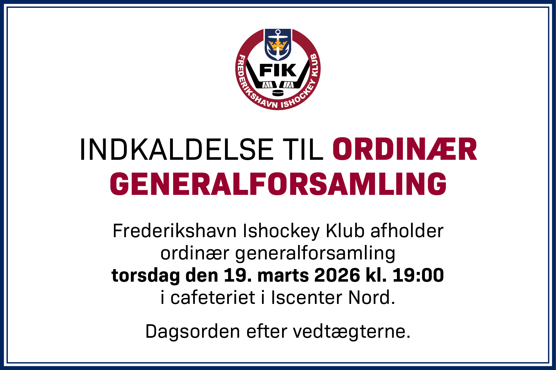 Frederikshavn Ishockey Klub afholder ordinær generalforsamling torsdag den 19. marts 2026 kl. 19:00 i cafeteriet i Iscenter Nord.